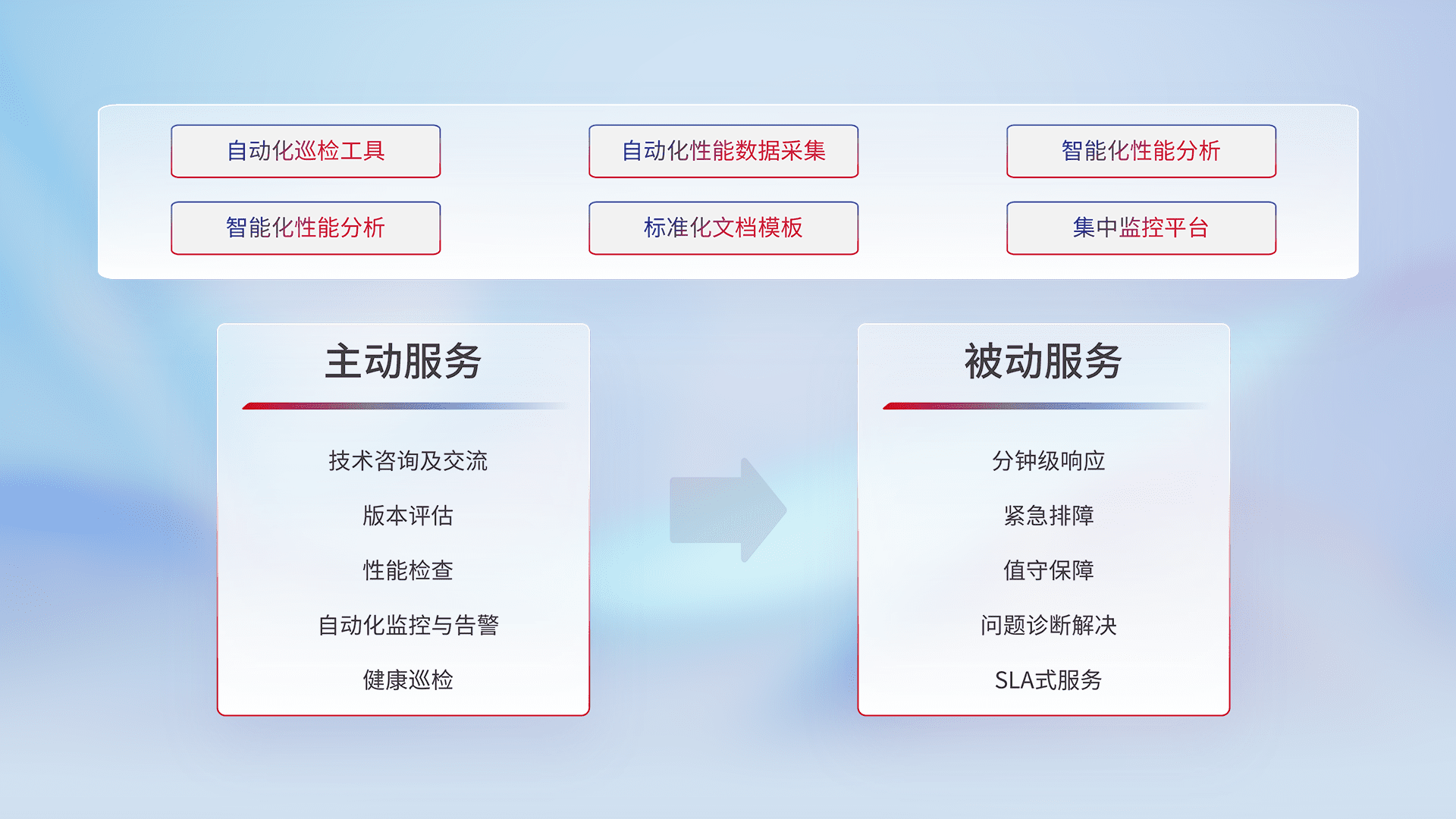 智能化工具和标准化文档,,,,保障服务质量,,提供主动服务(包含技术咨询、、、版本评估、、、性能检查、、自动化监控与告警、、健康巡检)和被动服务包含(分钟级响应、、紧急排障、、、、值守保障、、、问题诊断解决、、、、SLA服务)。。。。