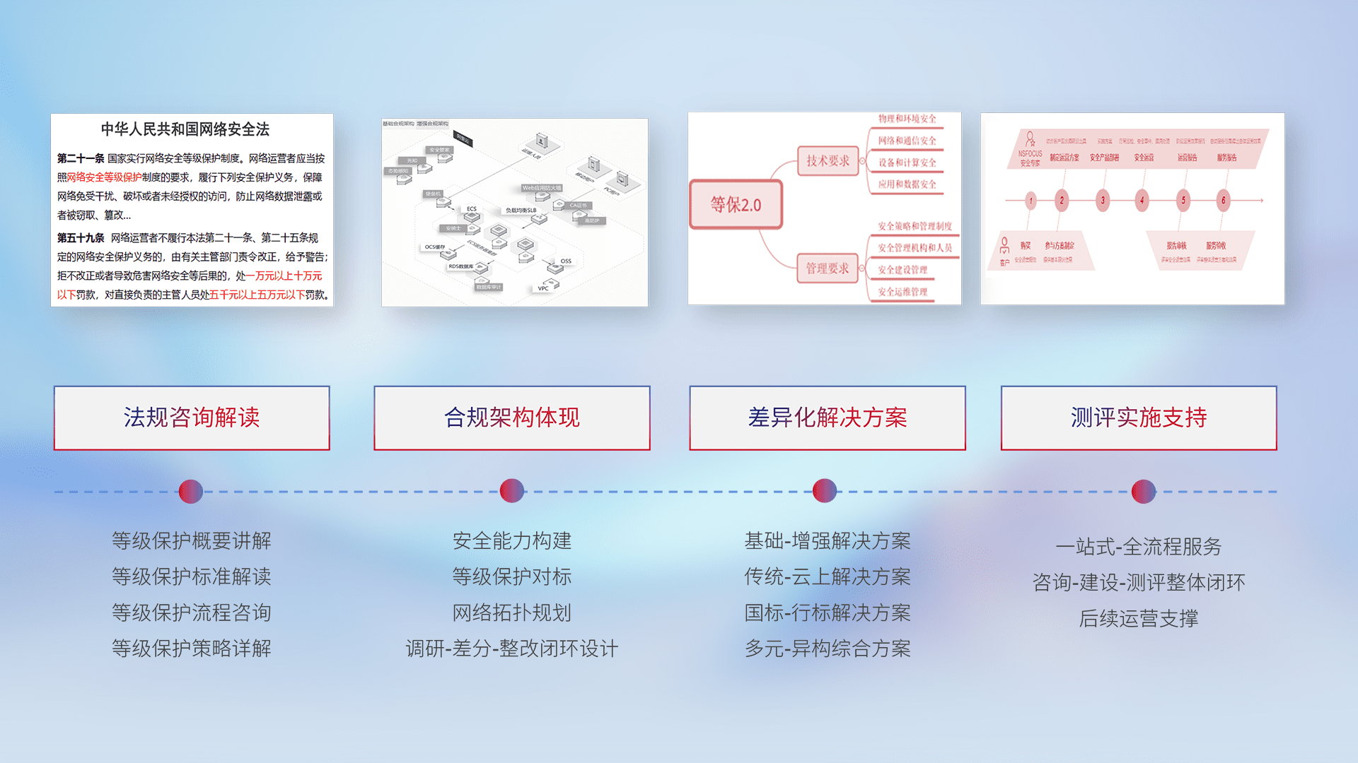 通过专业的法律咨询解读、、、合规架构体现、、、、差异化解决方案、、测试实施支持等服务,,,,为客户量身打造等保合规体系。。。。
